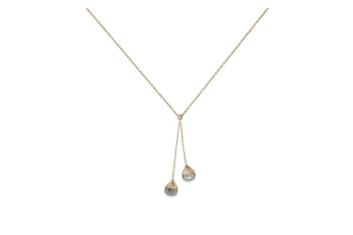 This elegant Adara drop necklace is handmade from natural Labradorite stones beautifully bound in 22 karat gold. The stones are cut and polished by hand by talented artisans working as part of a fair-trade enterprise in Rajasthan. Each piece is presented in a beautiful suede pouch.