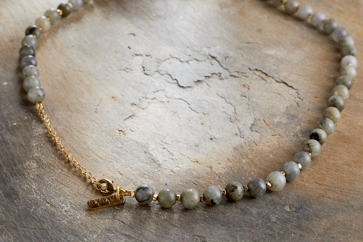 This elegant necklace features shimmering labradorite beads in a new, refined beaded design. The natural tones and subtle iridescence of the stone create a soft, light-catching finish that pairs beautifully with both everyday looks and more polished styles. Presented in a linen pouch, it-s a timeless addition to your jewellery collection.
